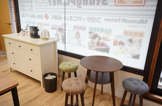 授業の合間にコーヒータイム!気分転換もできます。お子様が受講中でもお待ち頂く事もできます。